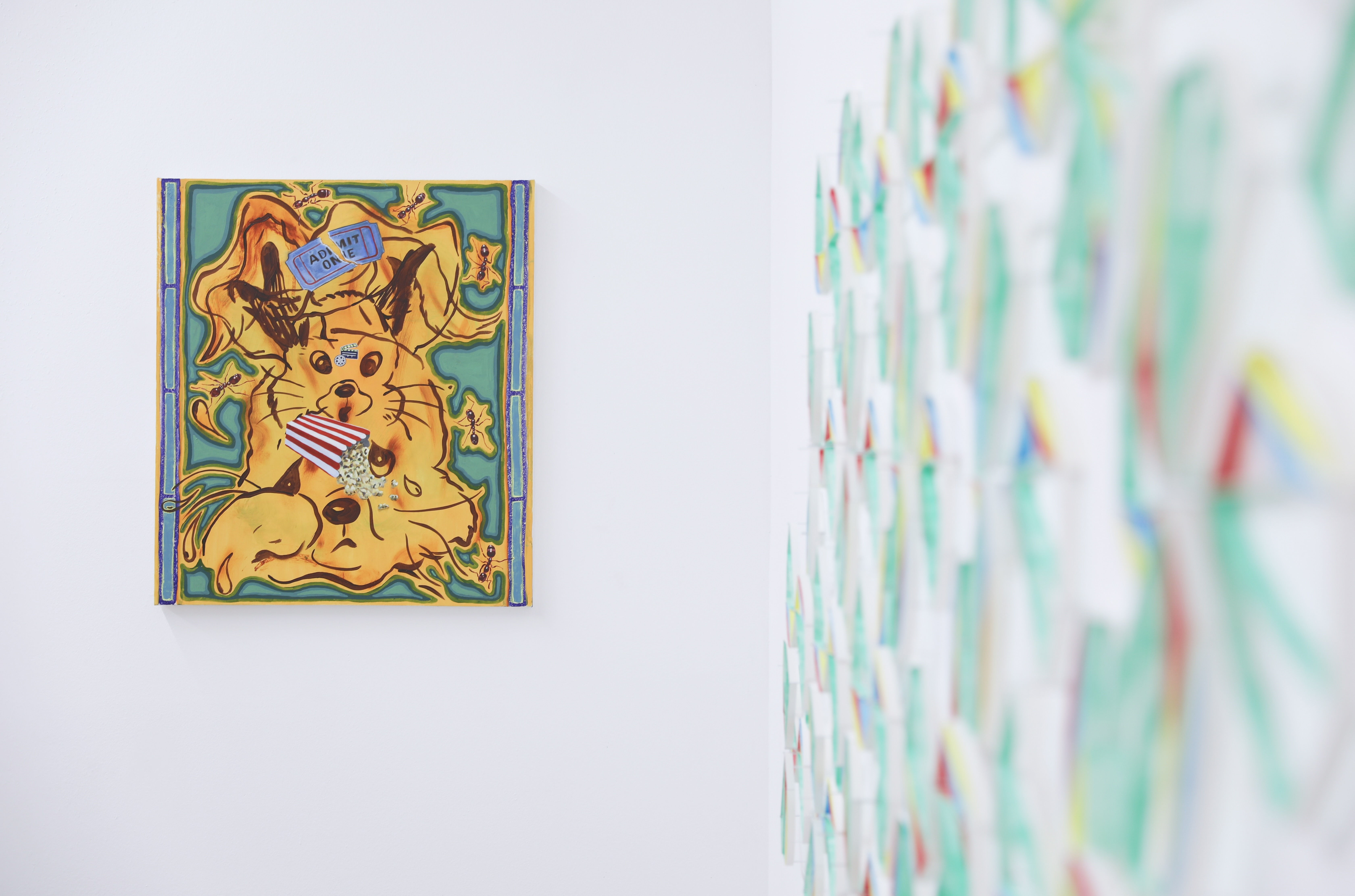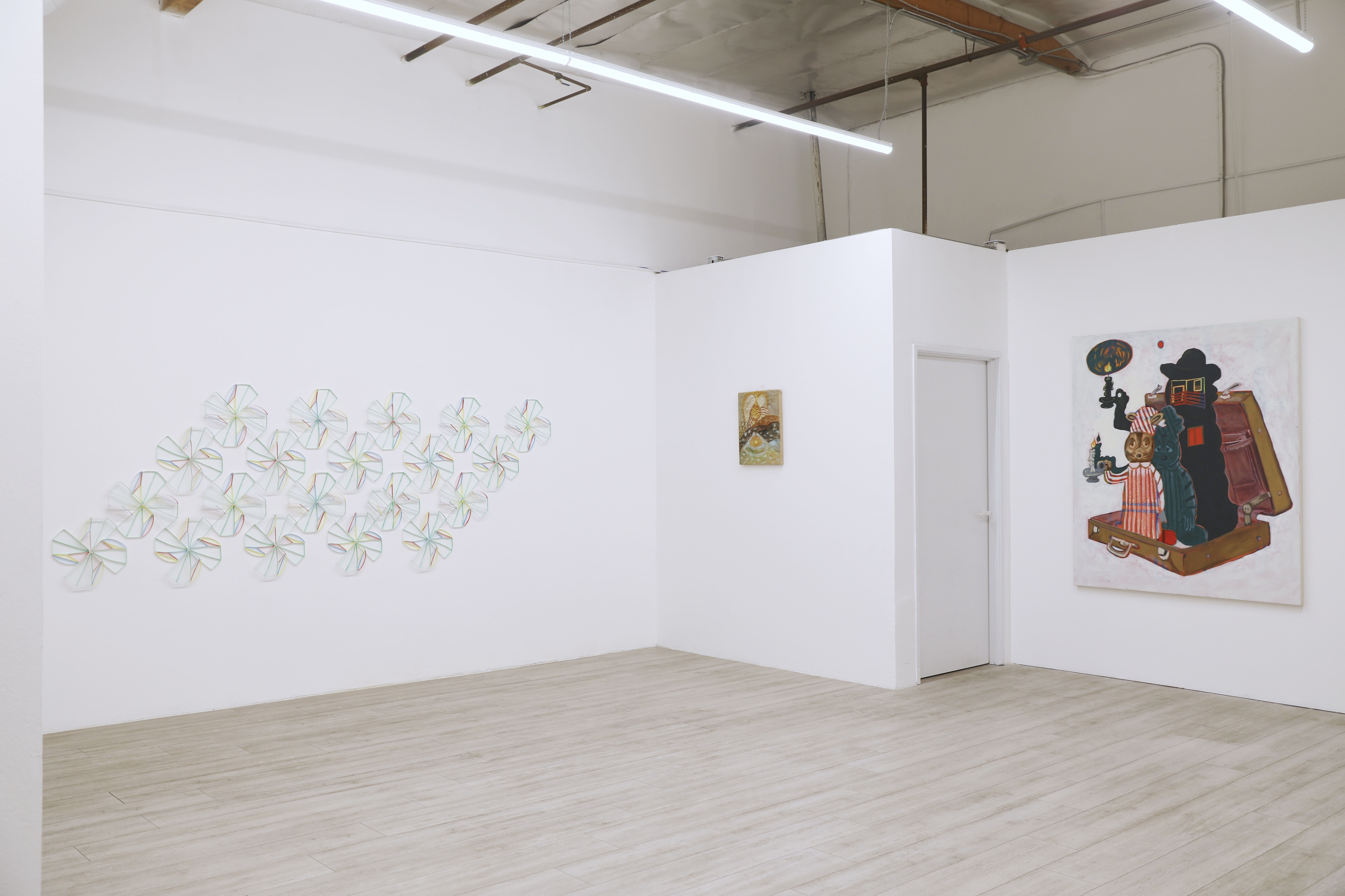 At the center of the exhibition, artist, community builder, curator and writer Alex Paik presents a site-responsive installation that at first glance appears to be a stained-glass floral design but it is, in fact, gouache and paper.